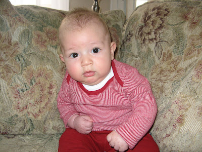 I'm 4 months old already! Mom asked me to wait until my check-up to make this post because she wanted to see how much I weigh now. Well, the numbers are in and I'm 17 pounds, 9 ounces. As for length and head circumference, my nurse forgot to leave the paper with that info so I will have mom call and find out tomorrow. But my doctor did say I am in the 95th percentile for weight and length and the 50th percentile for head circumference. I did a lot better at this appointment, I even smiled and talked to my doctor. I've figured out that he's okay...it's the nurse that I don't care for. First she makes me take off all my clothes (and I'm not even getting a bath), then she puts lots of shots in my legs that really hurt. Don't worry, I made sure I screamed real loud all the way out the door.